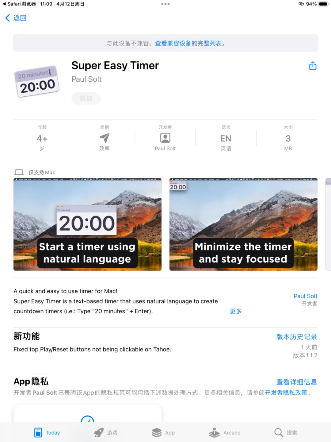 《Super Easy Timer》计时器,输入“20分钟”即可启动倒计时,操作简单。