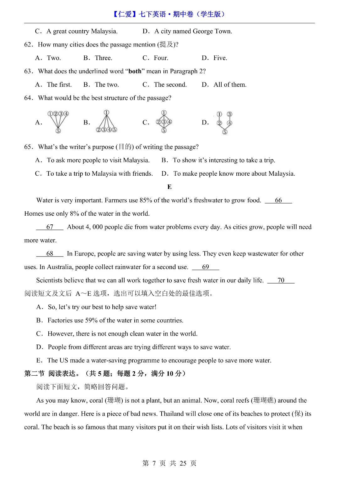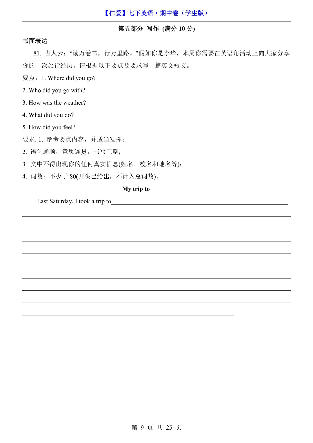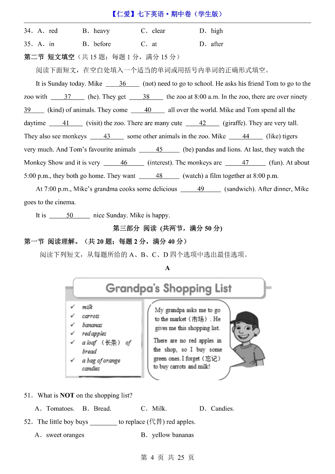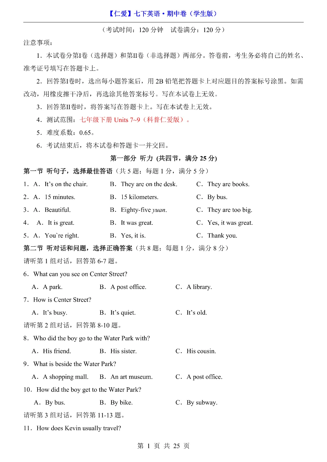 今天给家长们分享的是:26年春新七年级下册仁爱版英语《期中考试测试卷》含答案解析‖高清电子版可打印