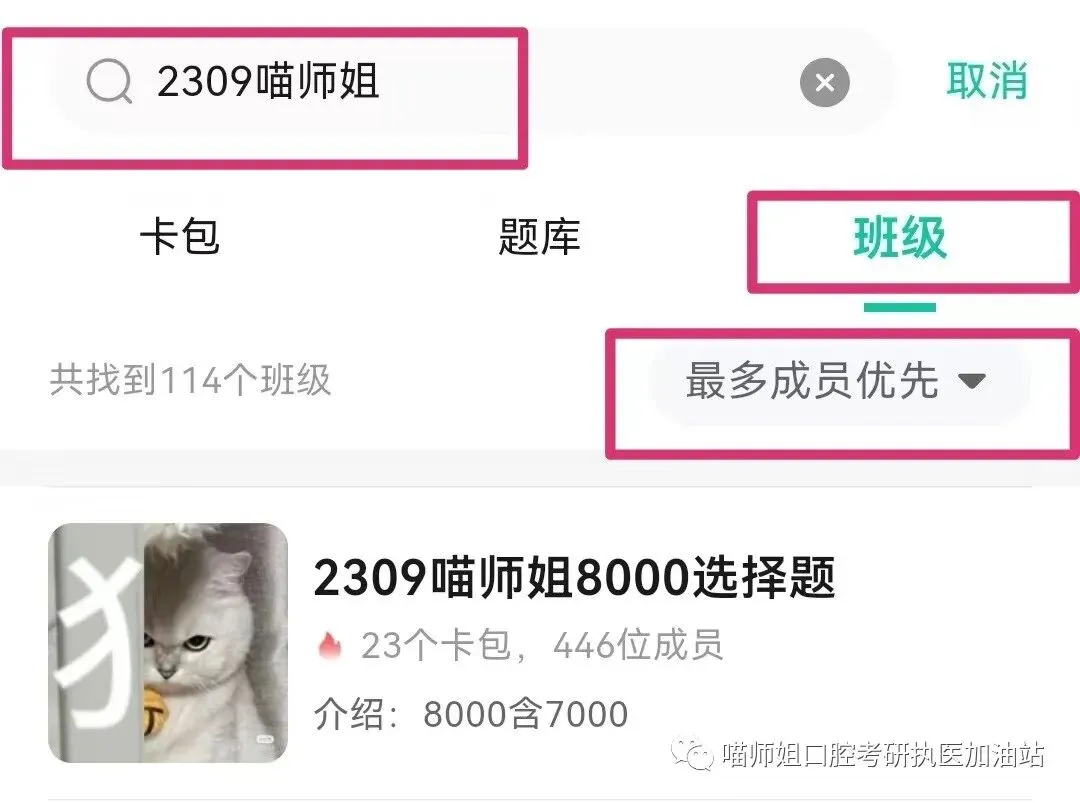 再切到发现页面,搜索“2309喵师姐”,切到班级菜单,选最多成员优先