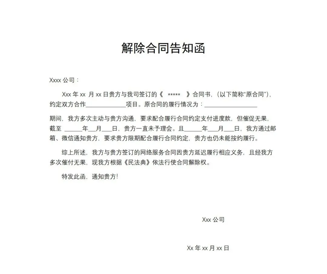 解除合同告知函模板,WORD文档电子版,可免费下载打印