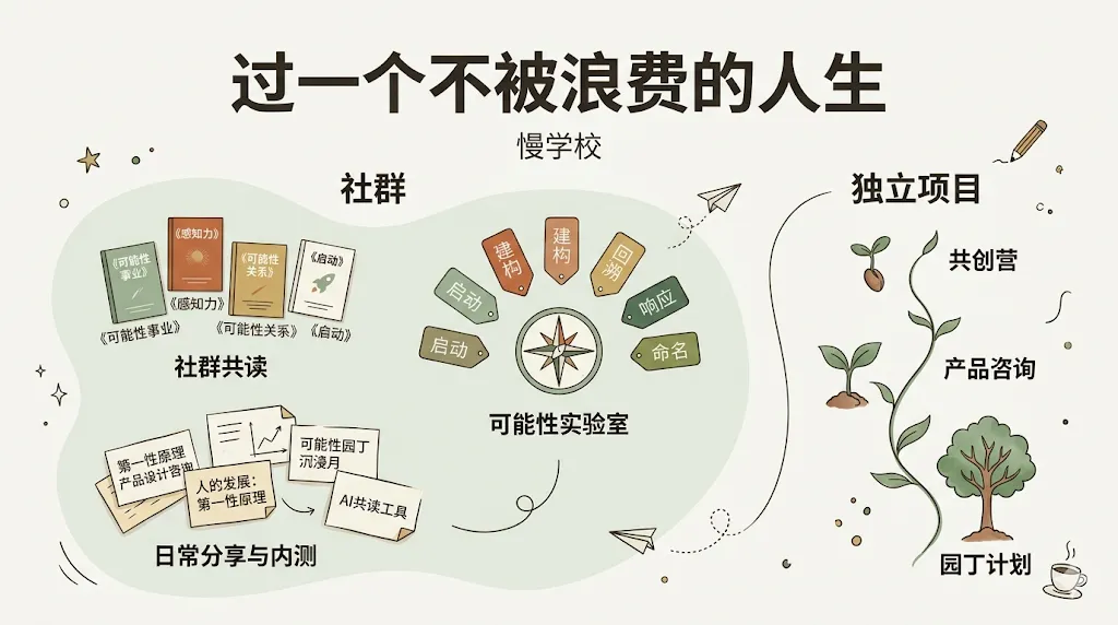 可能性实验室 每1-2个月一个主题,每个主题3-6场线上工作坊。每期一个方向:启动(灵魂文档和成长档案)、建构(个人创造系统)、回溯(可能性生命叙事)、响应(时代叙事)、命名(可能性事业探索)。采用个人实践+集体反馈的形式:安猪先示范,你跟着做,带着自己的成果回来,一起对话讨论。