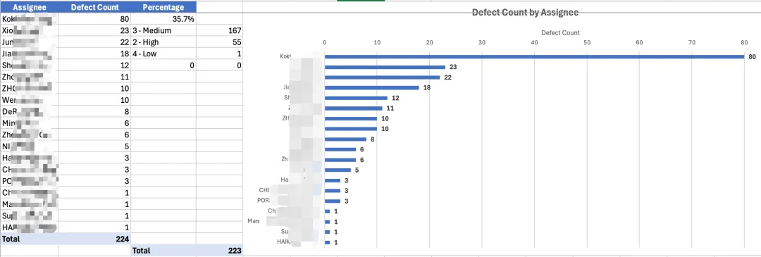 “帮我统计每个 Assignee 分别有多少条缺陷,结果放到新的 Sheet 里”