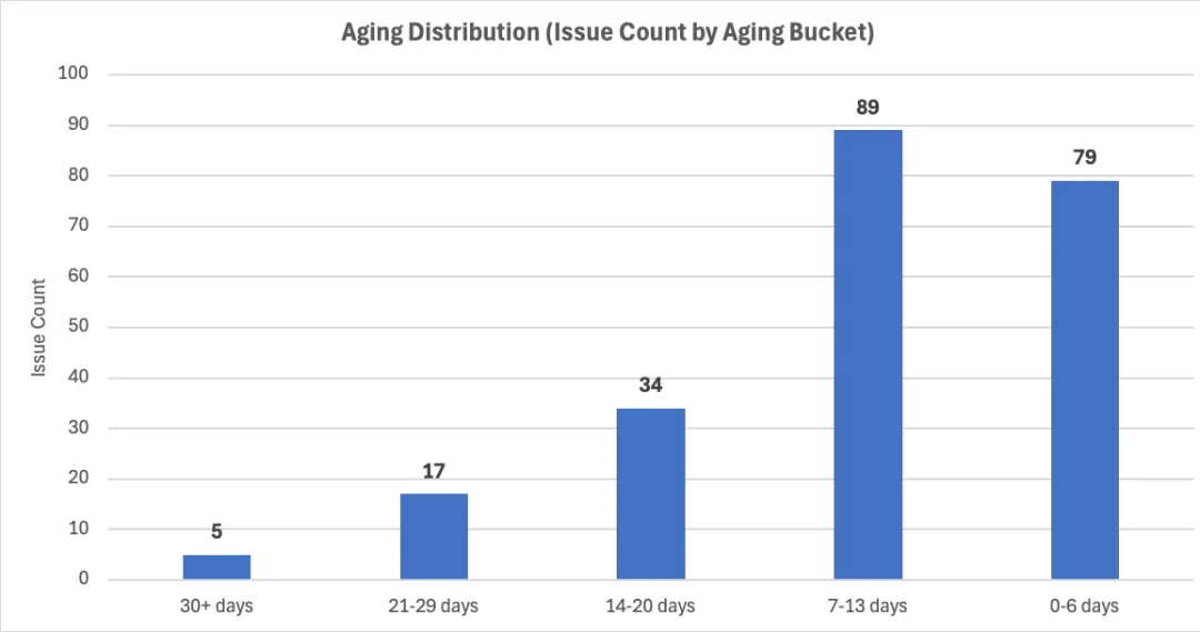 它会自动算出每条缺陷的 aging 天数,按严重程度倒序排好,再生成图表。