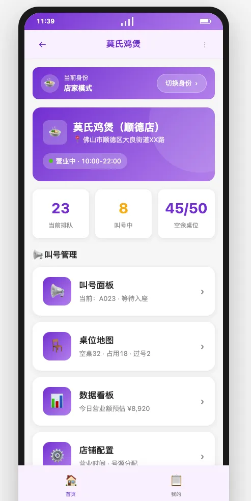 构思:开发一个多角色账号的叫号小程序,客户端是核心的现场等号和预约排号功能。店家端是叫号、落座台号、过号等操作。