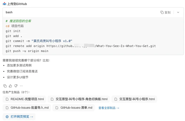 全流程走完后,我让WorkBuddy把产物统一归档到GitHub,形成可追踪的版本记录。