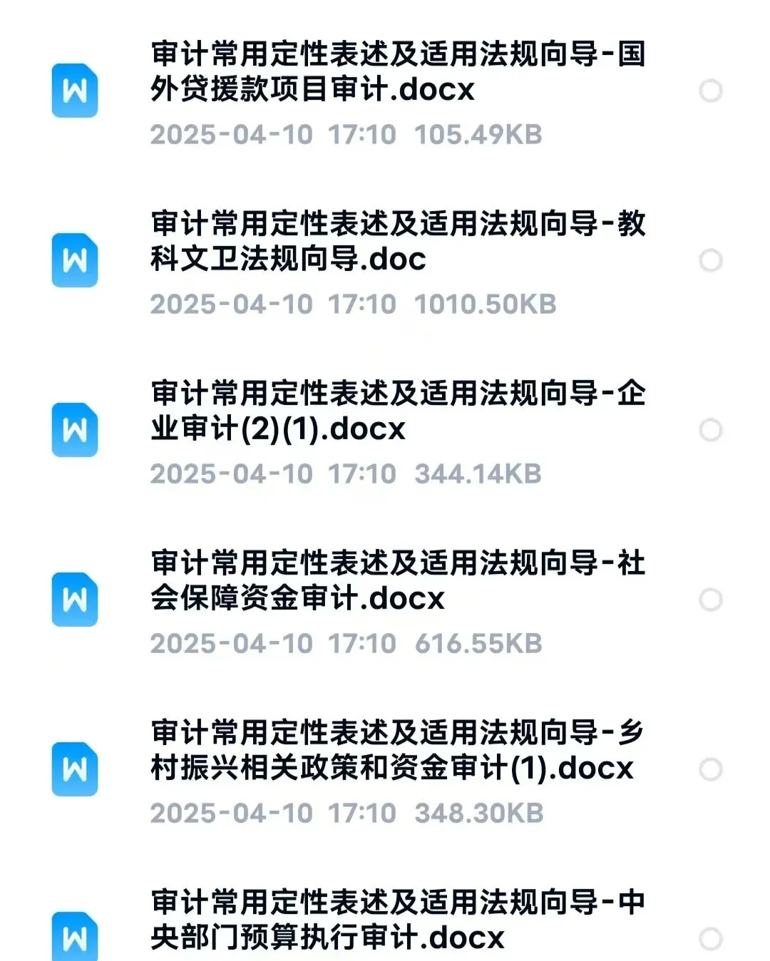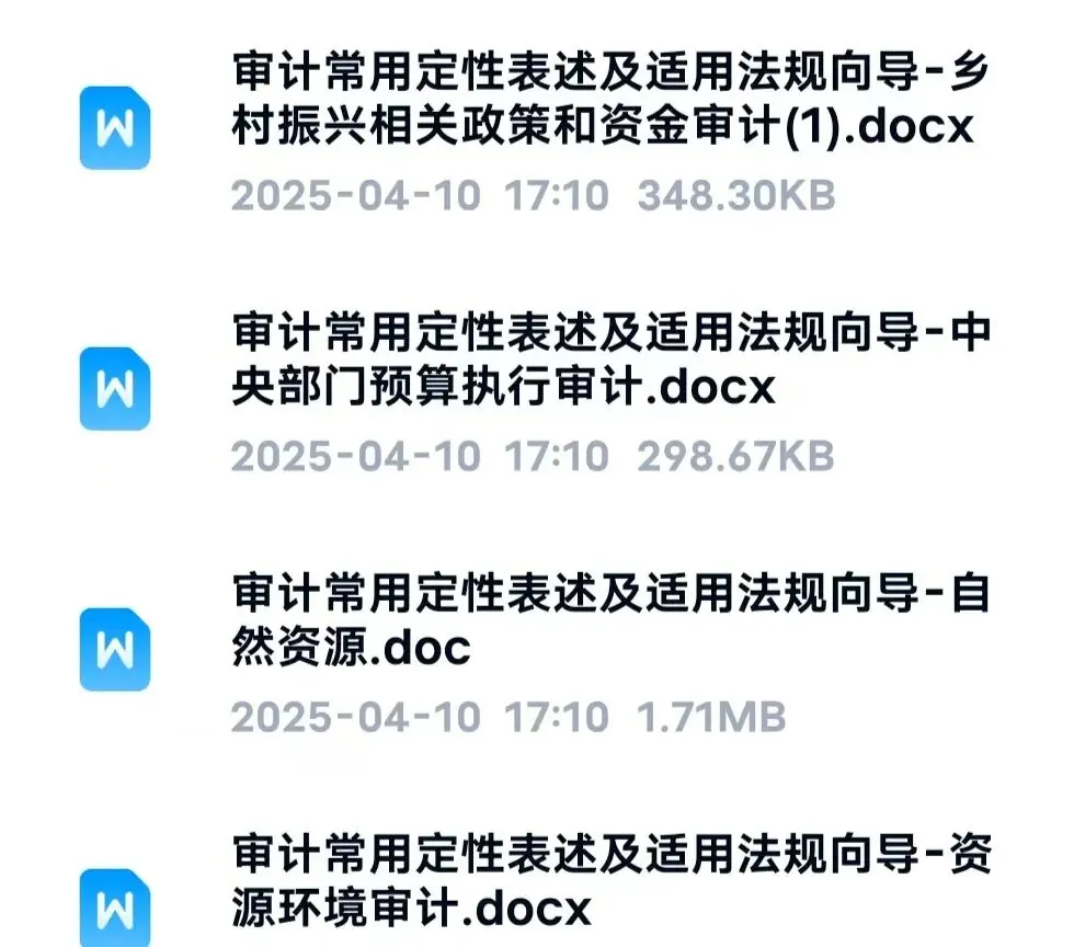 审计常用定性表述及适用法规向导合集,电子版资料,Word和PDF都有,内容涵盖乡村振兴、中央部门预算、自然资源、环保、教科文卫、企业、社保、国外援款等多方面,适合审计、财务、企业管理学习参考。