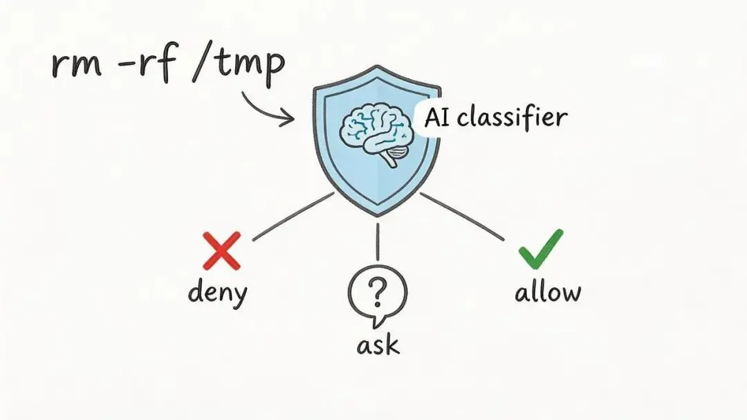 它做的事情是:当 Claude Code 要执行一个 bash 命令时,不是拿正则去匹配黑名单,而是把命令再发给一个 AI 分类器,让另一个 AI 判断”这个命令安不安全”。