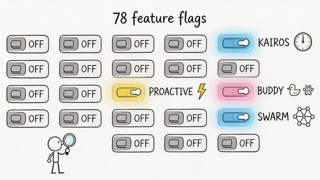 我用 grep 扫了整个源码,78 个 feature flag。每个都是用 Bun 的 dead code elimination 保护的:关掉的功能在构建时完全消失,但源码里的逻辑完好无损。
