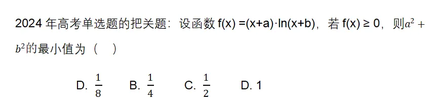 试想一下,如果这道题把前面的障眼法去掉,直接给出b=a+1的条件,让你求a^2+b^2的最小值,那这就是一道简单题了,初中生都会做,也就没资格成为一道高考小把关题了。