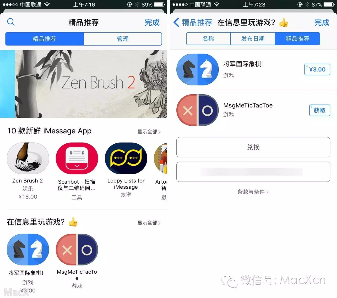 信息 App Store 的外观设计与 iOS App Store 很相似,对于 iOS 10 用户来说,可以很快熟悉。推荐的应用通过幻灯片的形式显示在顶部,同时下方还有编辑推荐,包括“10款新鲜 iMessage App” 以及“在信息里玩游戏?”等合集。支持信息 App Store 的应用包括 Tic Tac Tow、Star Walk、IMDB、Yelp 和 Zen Brush 2 等。