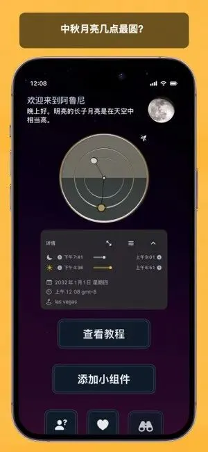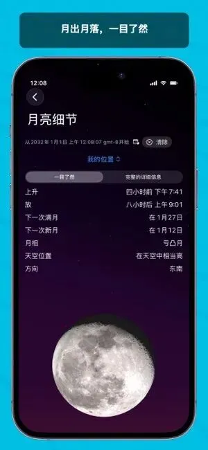 一款天文节律应用,可查看月相亮度、日月当前位置,追踪日出日落、月出月落时间,预测满月、新月、至日、分点等特殊天象,支持添加桌面小组件快速查阅。应用支持离线使用、无广告、设计简洁,能便捷满足用户赏月、观天等需求。