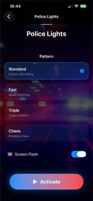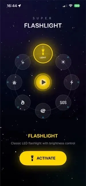 一款超级手电筒应用,可将iPhone转为多功能光源,搭配太空主题界面。共8种模式:支持LED手电亮度调节、全色域屏幕灯、1-25Hz可调频闪、SOS摩斯求救信号、6种彩色光效、4款蜡烛氛围灯、警灯模式、音乐同步迪斯科灯。无广告无冗余权限,启动快耗电低。