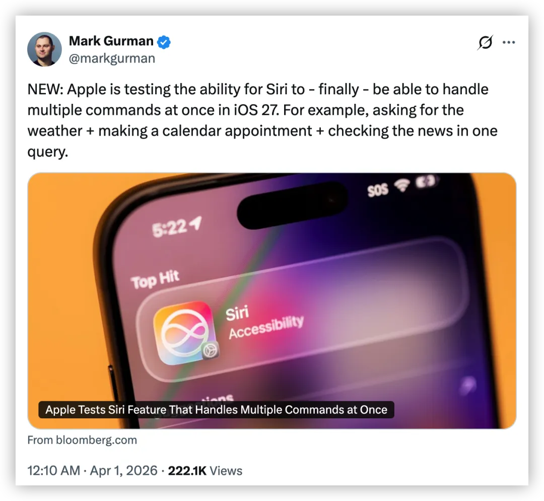 不过这局面可能在今年 9 月迎来剧终。彭博社Mark Gurman 那边又发话了,说苹果这次是动真格的,iOS 27 里,苹果这次不打算小修小补,而是准备把 Siri 从系统底层“抠”出来,变成独立桌面 App,彻底甩掉“人工智障”的帽子。