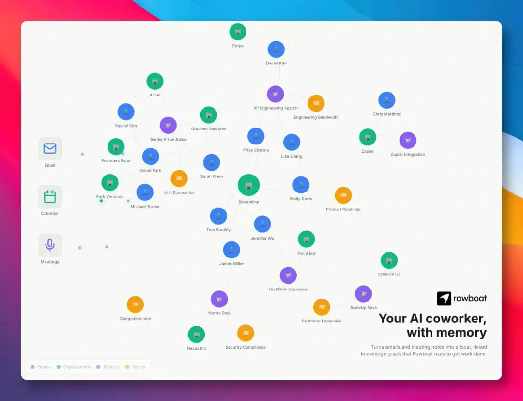 最近发现了一个开源项目——Rowboat,它通过自动从我们的邮件和会议记录中构建知识图谱,基于这些积累的上下文帮助我们更高效地工作。与普通的AI助手不同,Rowboat不是每次临时搜索,而是持续积累我们的工作记忆,越用越懂我们。所有数据以Markdown文件形式存储在本地,可以随时查看和编辑。