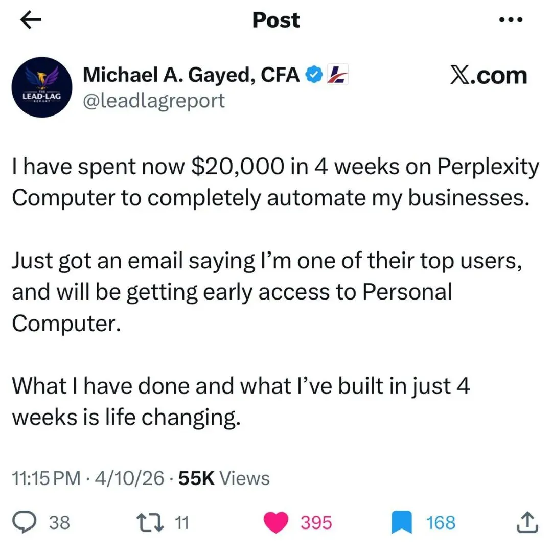 一位用户在推特上分享了他的体验,他在短短四周内花费了20,000美元用于Perplexity的个人电脑,以完全自动化他的业务。他收到了一封邮件,通知他已成为Perplexity的顶级用户,并将获得个人电脑的早期访问权限。他表示,这四周期间所实现的自动化成果改变了他的人生。