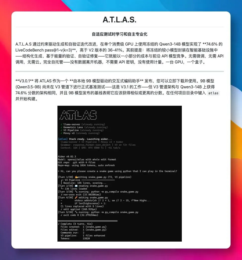 如果你希望在本地运行一个可靠的AI编程助手,而不依赖云端API或为token付费,ATLAS是一个值得考虑的选择。