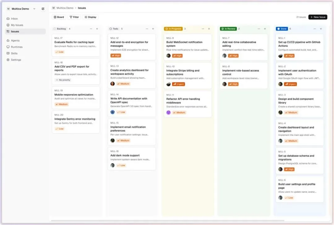 最近开源的Multica平台提出了一种全新的思路,将AI编程助手转变为真正的虚拟团队成员。用户可以像给同事分配任务一样,在看板上发布需求,AI会自动接收并开始编程工作。执行过程中遇到问题时,AI会自动汇报并更新任务状态,彻底解决了手动监控的问题。