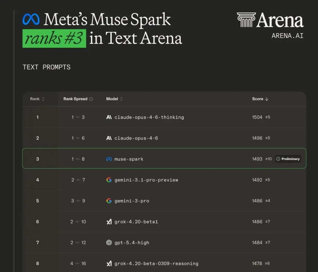 Meta公司最新推出的Muse Spark在LM Text Arena中取得了第三名的好成绩,与Gemini 3.1 Pro并列。这是Meta自2025年初以来的首次重大发布。