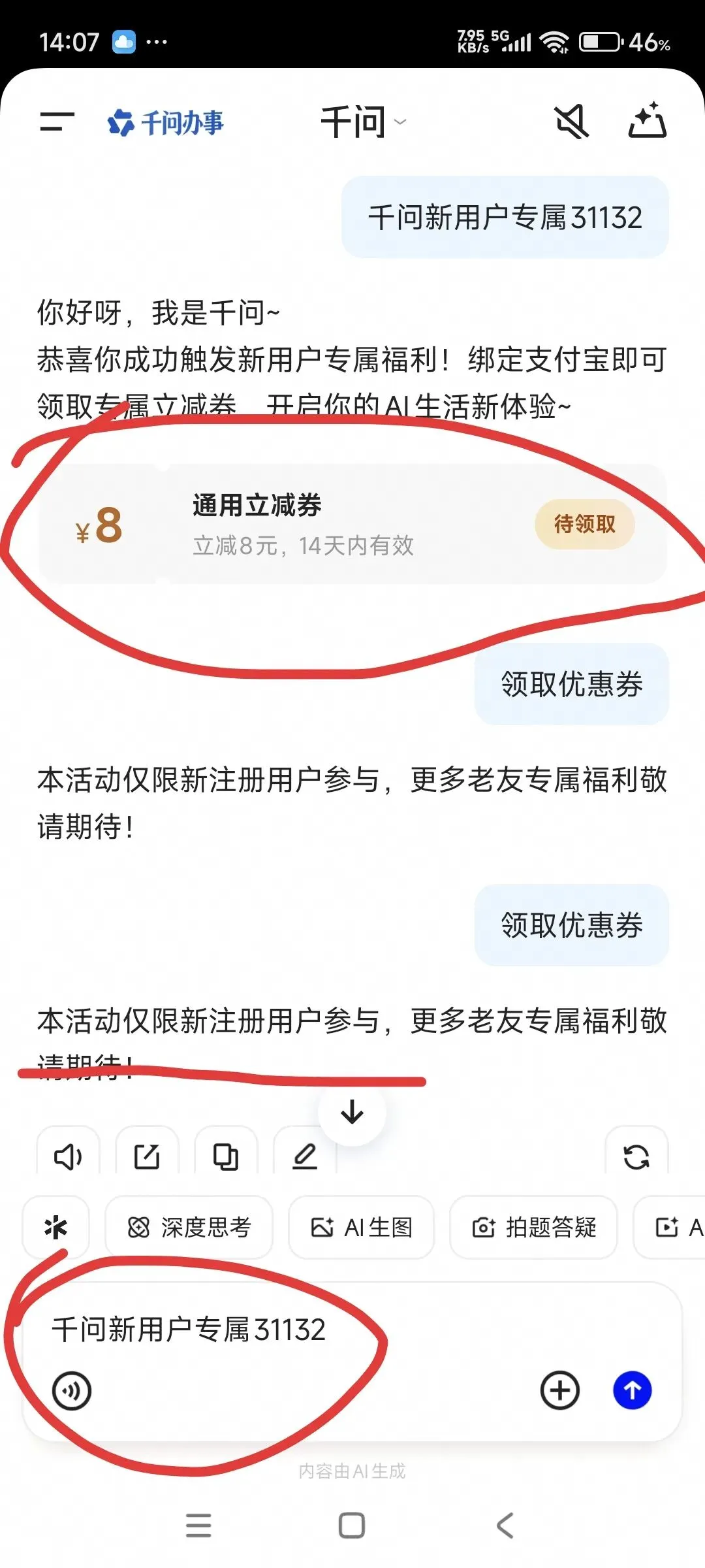 千问app必中8元无门槛红包千问app发口令《千问新用户专属31132》领不了的换号,可以叠加淘宝闪购多号换号去拿,家里人账号试试