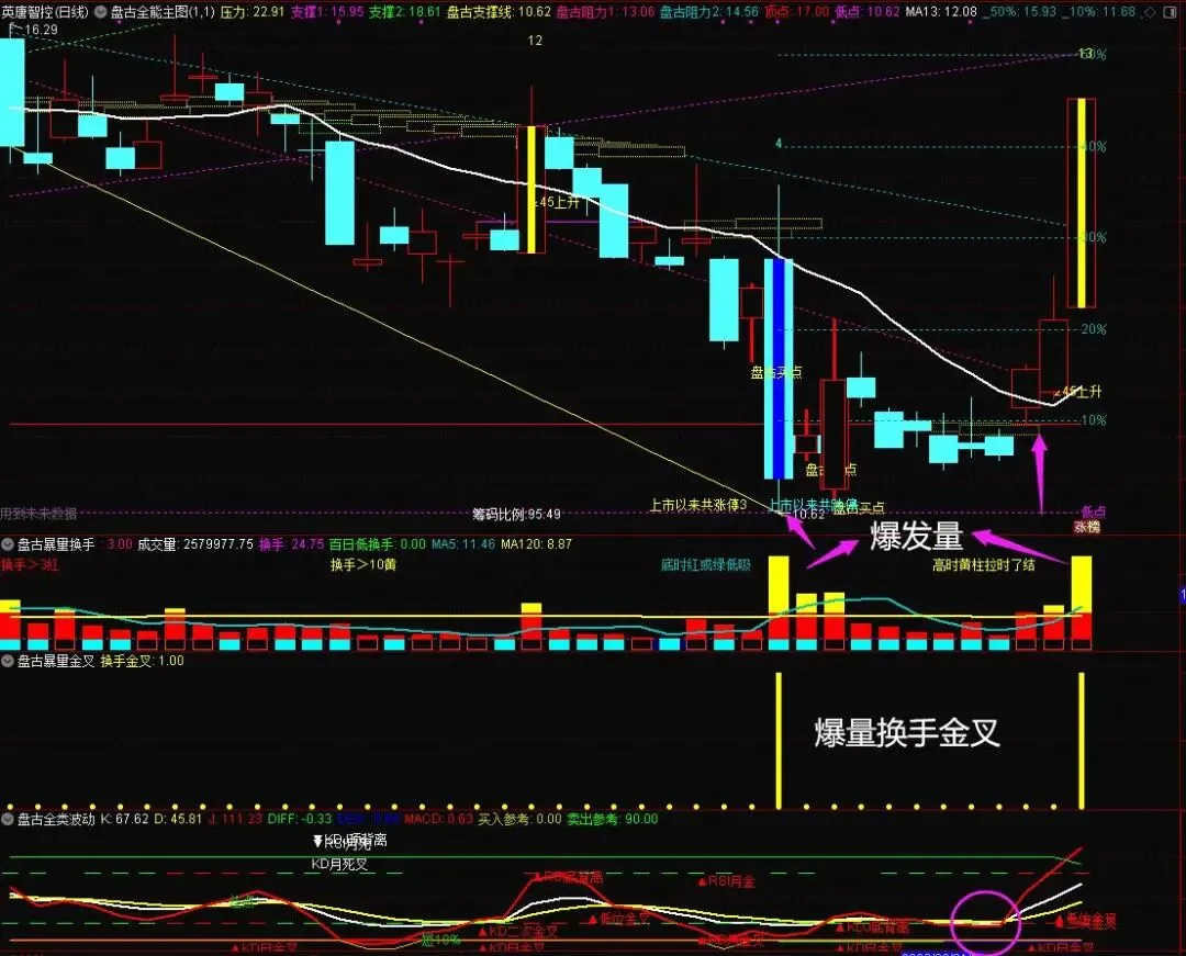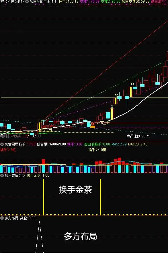 ZLBU129:=ZLBU125 AND ZLBU127 AND ZLBU128 AND REF(NOT(ZLBU128),1) AND (多方布局>空方布局) AND (MA22<= MA11) AND (布局>散户) AND (DIFF>DEA) AND (K>D) AND (RSI1>RSI2) AND (LWR1>LWR2) AND (CLOSE>BBI) AND (MMS>MMM);