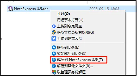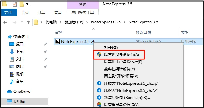 第三步:选中解压出来的【NoteExpress3.5_zh】程序,右击【以管理员身份运行】。