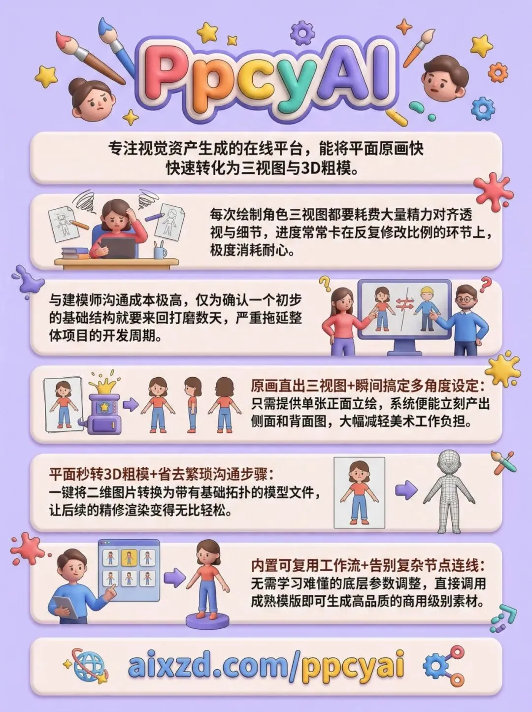 每天一个提效AI工具,今天是推荐的第283款。Ppcy AI直接把这些麻烦砍掉:只需上传一张平面的角色正面图,系统就能瞬间补齐侧面和背面,透视和服装细节自动对齐,看起来就像手动精修过一样严谨。Ppcy AI还能一键把2D平面图转成带拓扑结构的3D粗模,让美术资产的前期搭建既高效又精准。① 原画直出三视图+精准对齐透视:不用再一点点拉辅助线去死磕比例了,单张立绘丢进去就能秒出正、侧、背三视图,连复杂的布料褶皱和配饰细节都能保持高度一致,让角色设定工作变得像喝水一样自然。