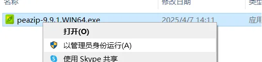 2.打开解压后的文件夹,找到【peazip-9.9.1.WIN64.exe】应用程序,右键选择【以管理员身份运行】。