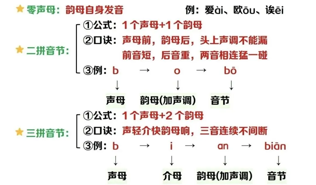 ②口诀:声母前,韵母后,头上声调不能漏前音短,后音重,两音相连猛一碰