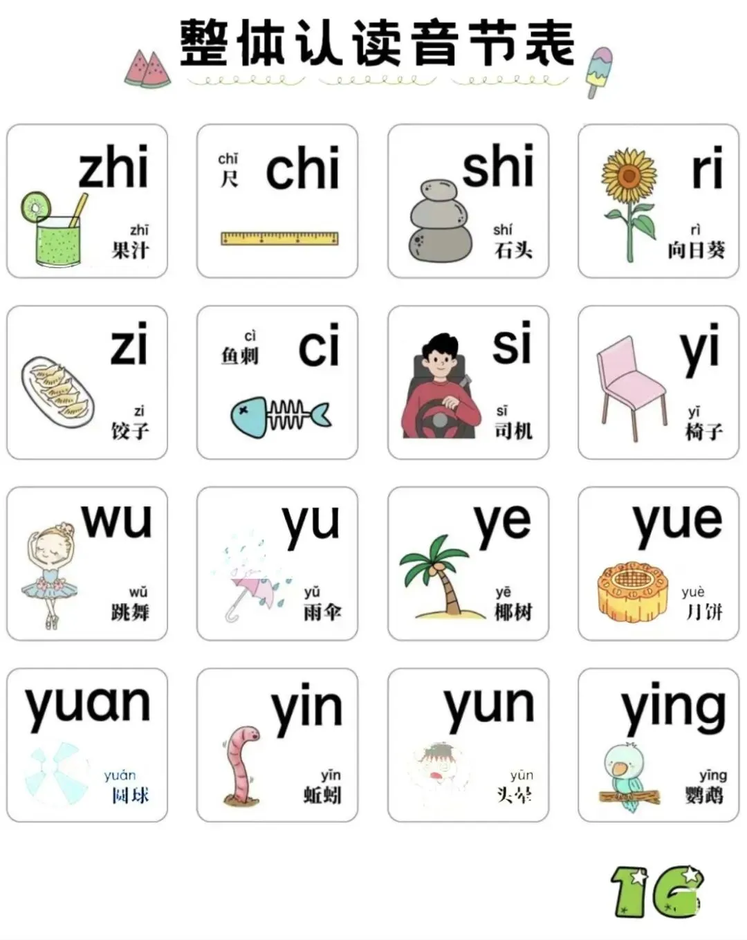 zhi、chi、shi、ri、zi、ci、si、yi、wu、yu、ye、yue、yuan、yin、yun、ying