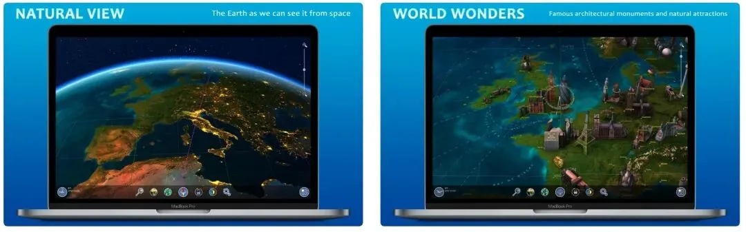 精致的 3D 地球仪应用。你可以从这款应用查看世界各地的地貌,城市,名胜古迹,地标性建筑等,3D 版本让这些信息更加生动,学地理不再枯燥。点击具体的建筑模型、海洋、湖泊或者城市还会弹出较为详细的文字介绍和维基百科链接。应用颇为用心的设计了符合直觉的触控板手势操作同样是一个亮点。