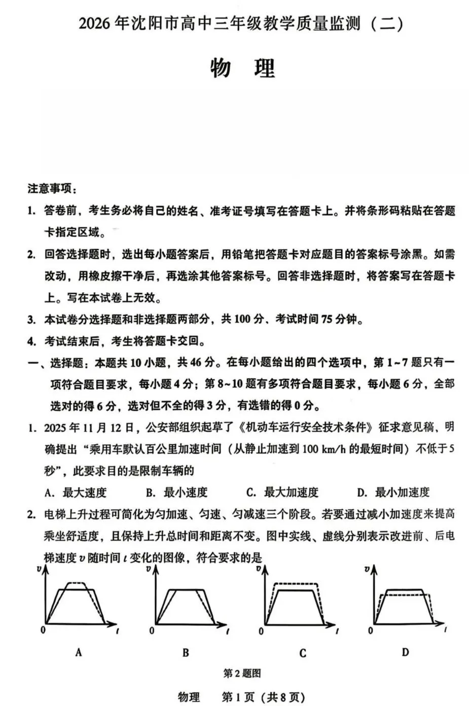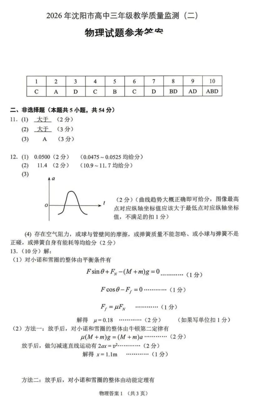 2026年沈阳市高三二模物理试题及答案