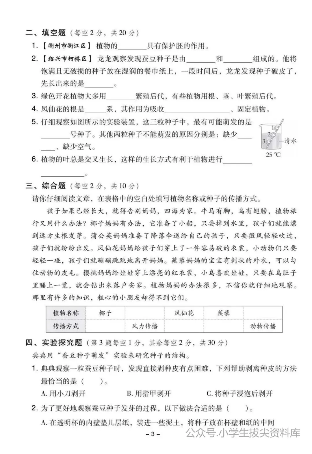 四年级科学第一单元测试,附带答案,电子版可打印