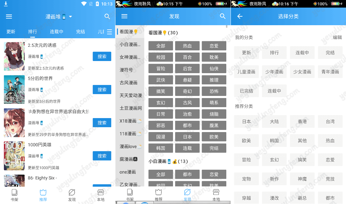 导入书源成功后,一些推荐分类版块就有内容了,不知道看什么的时候可以在这些版块里找到喜欢的漫画