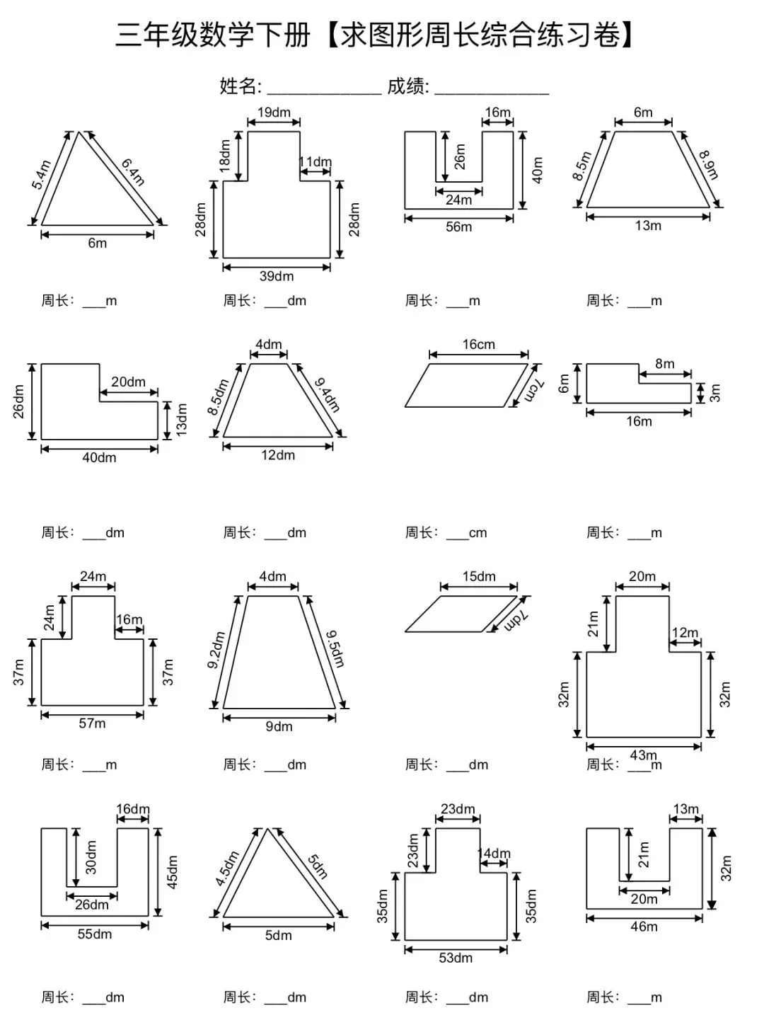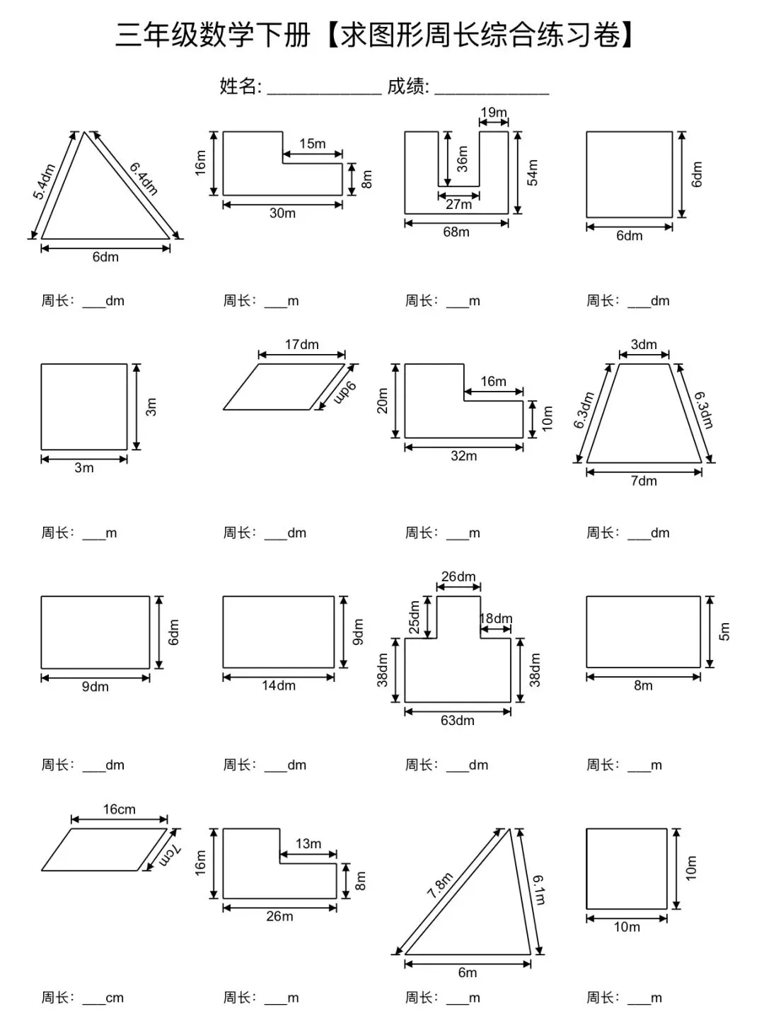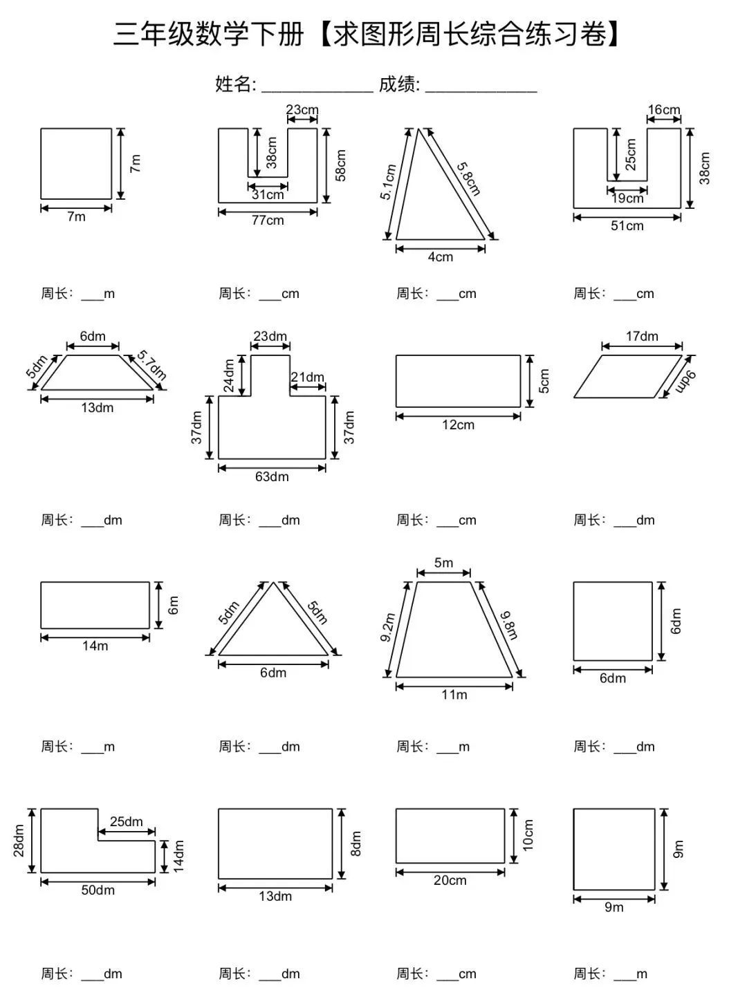 三年级数学下册[求图形周长综合练习卷](电子版可打印)