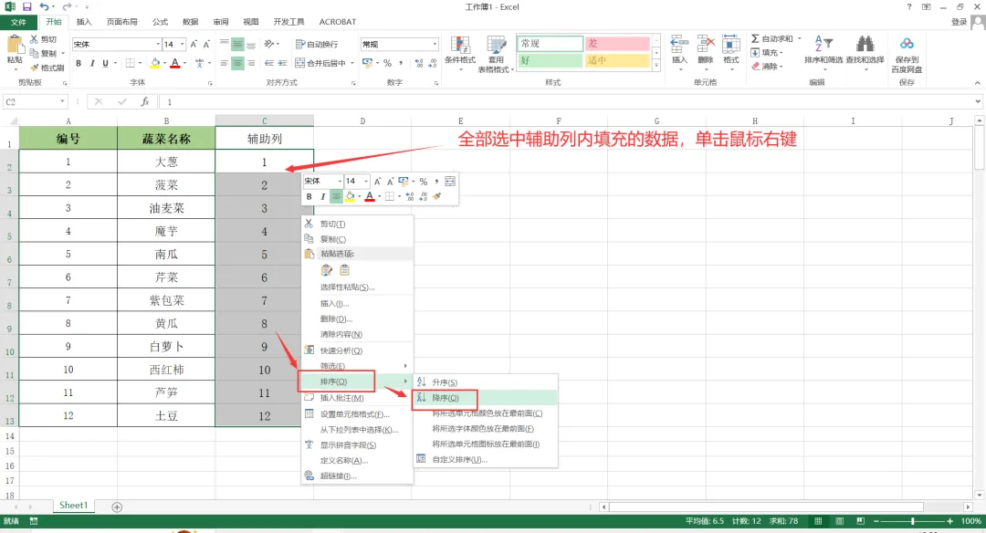 2、全部选中辅助列内填充的数据单击鼠标右键,然后在展开的下拉菜单中点击【排序】-【降序】,弹出“排序提醒”对话框。