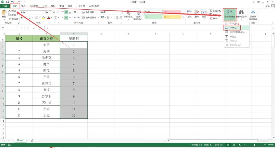 注:或点击【开始】-【排序和筛选】-【降序】,也可对选中内容排序。
