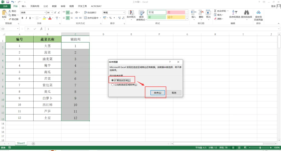 3、在弹出的“排序提醒”对话框中,选择【扩展选定区域】,然后点击【排序】,这样表格数据就倒置重新排序了,再将辅助列删除即可。