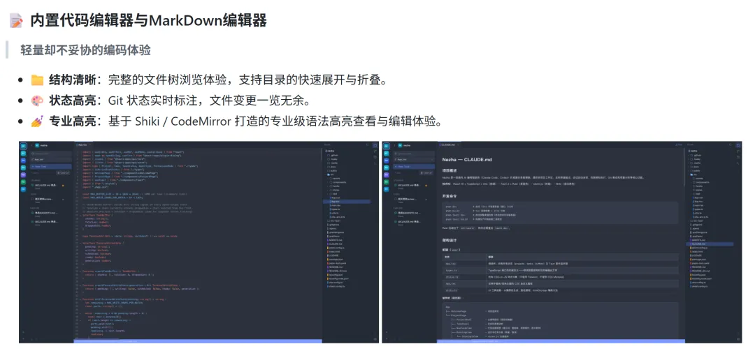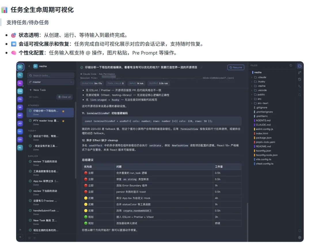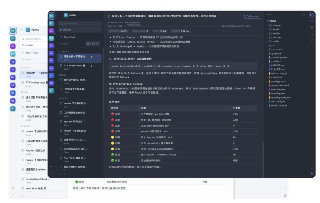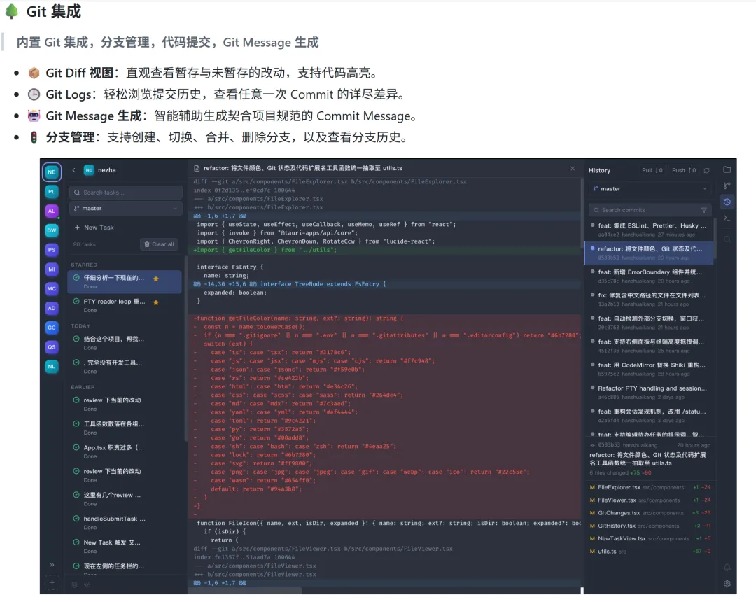 哪吒以 Agent 优先设计,内置终端直接集成原生 Claude Code 和 Codex。并在此之上集成 任务系统,Git, 终端和代码编辑器。使得对于轻度需求无需打开笨重的 IDE 即可完成任务下发,代码 Review,代码提交等操作的闭环,而且不会打断你在其他项目进行中的工作。