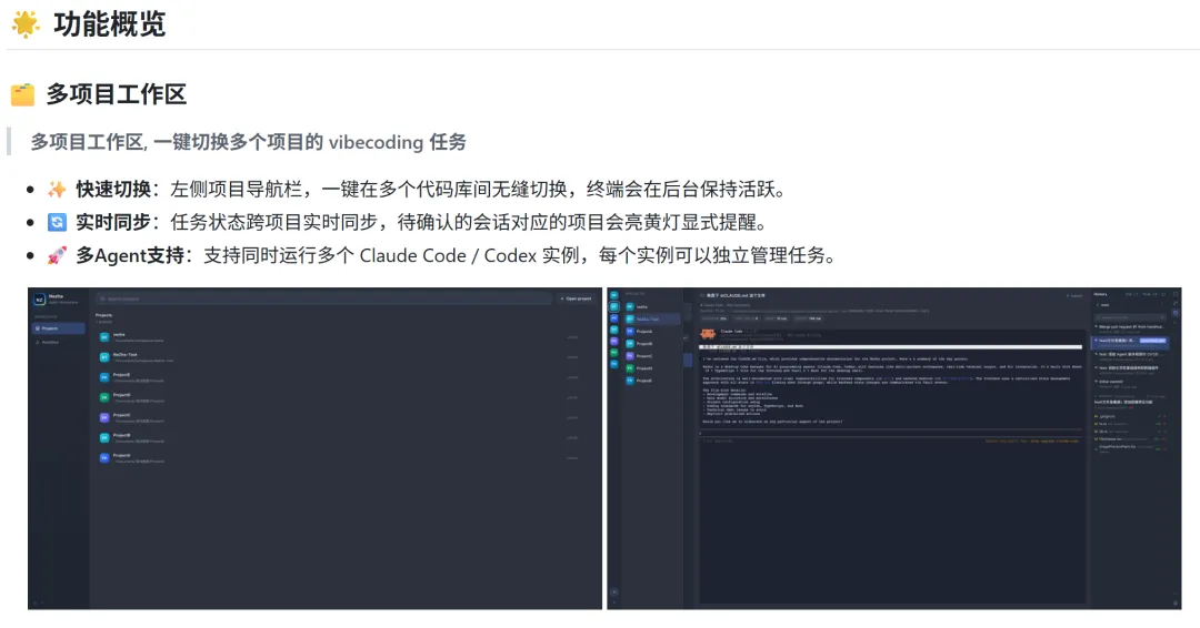 在单一界面中同时管理多个项目与多个 vibecoding 任务,虚拟终端运行原生的 Claude Code / Codex, 提供接近本地终端的实时输出与交互体验. -