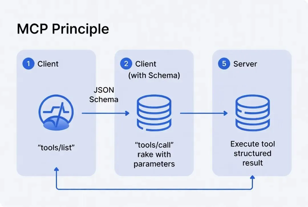 MCP采用Client-Server架构,核心基于JSON-RPC协议。AI Agent(Client)首先通过tools/list接口发现MCP Server暴露的工具列表,每个工具包含详细的JSON Schema(输入参数、输出格式、描述等)。Agent决定调用后,通过tools/call接口发送结构化请求,Server执行后返回结果。该过程将工具描述加载到模型上下文,确保类型安全和可解释性。