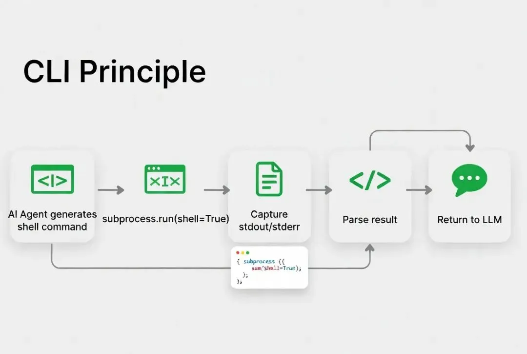 CLI的原理更为直接:Agent根据任务生成纯文本Shell命令字符串,通过subprocess或类似机制在沙箱环境中执行,捕获标准输出(stdout)和错误(stderr),然后解析结果返回给模型。整个流程依赖LLM对Unix命令的先验知识,无需预先加载Schema。