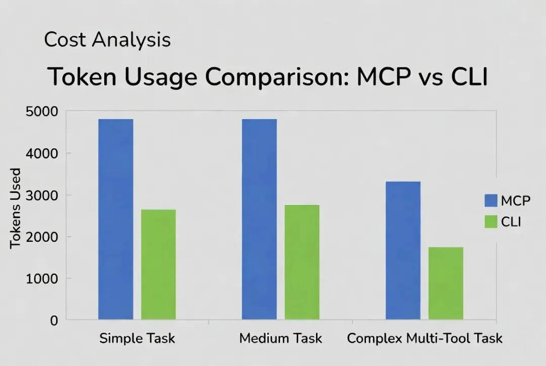 CLI的成本显著更低,几乎无需额外Token开销,仅执行命令本身。部署仅需预装常用CLI工具。