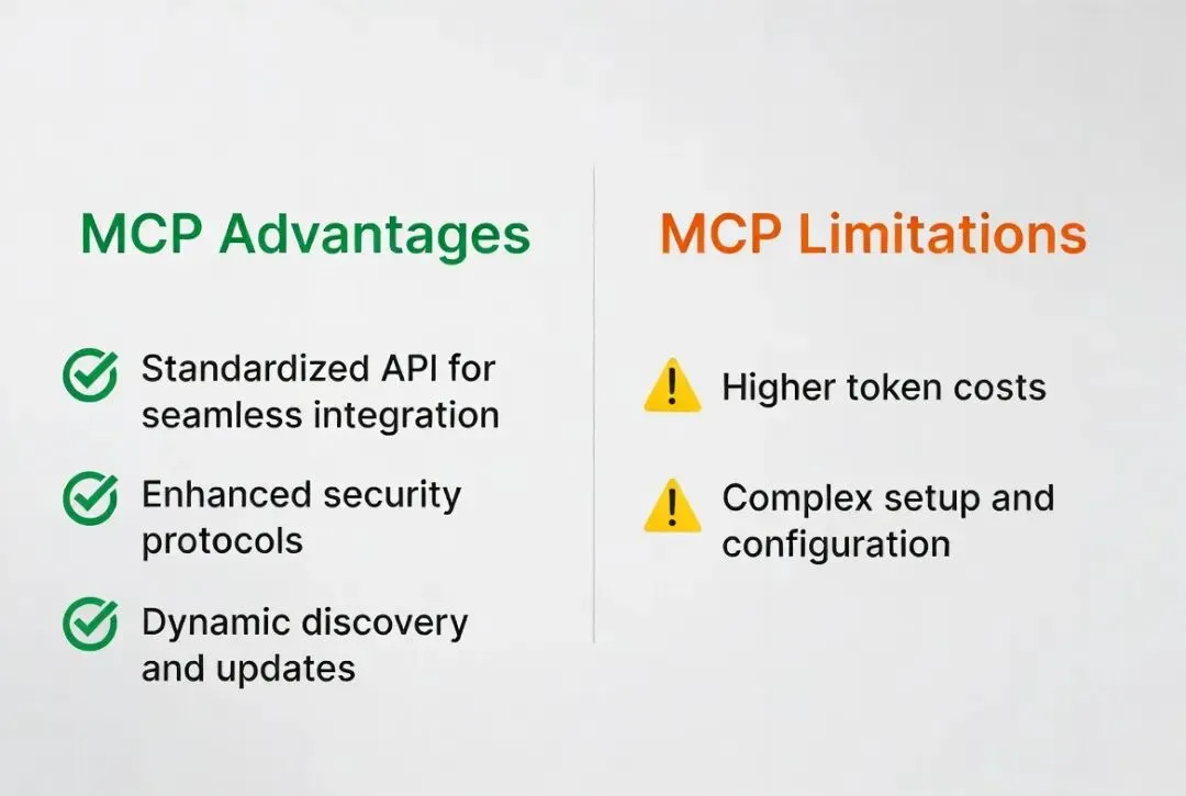 MCP的优势:标准化程度高,工具描述清晰,支持运行时发现和动态加载;安全性与治理能力强,适合多租户和企业环境。不足:上下文膨胀导致成本上升,部署门槛较高。