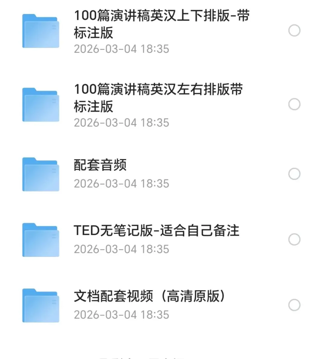 精选100篇TED演讲英语双语精读竖版PDF文档和配套视频(推荐打印) 精选100篇TED演讲英语双语精读资料【分类】教育【资源内容概述】该资源包含100篇TED演讲的PDF文档和配套视频,提供英语双语精读,高清资料电子版,可打印、可下载,无水印,同步学校新课标最新版 第一步:下方点个【和】 第二步:复制到浏览器打开 https://pan.quark.cn/s/5af5fe03fd7e