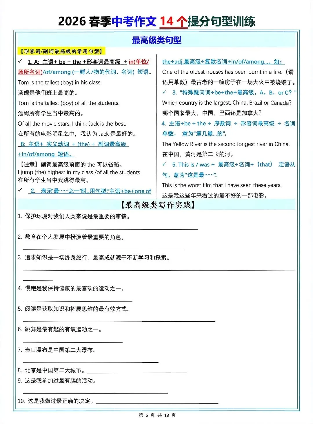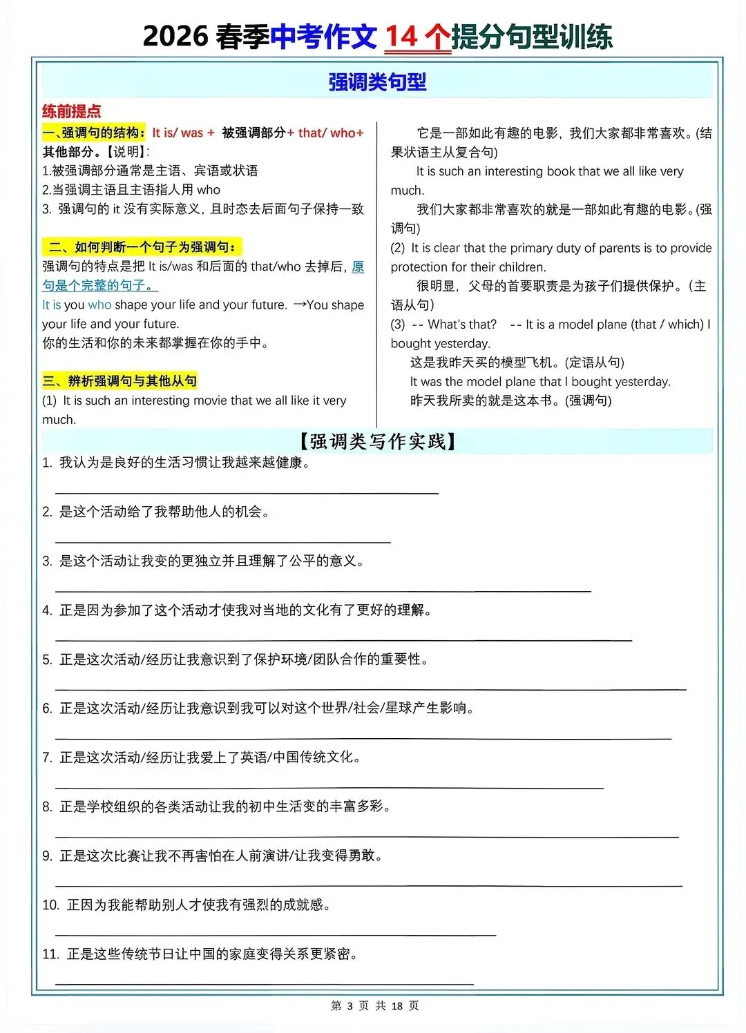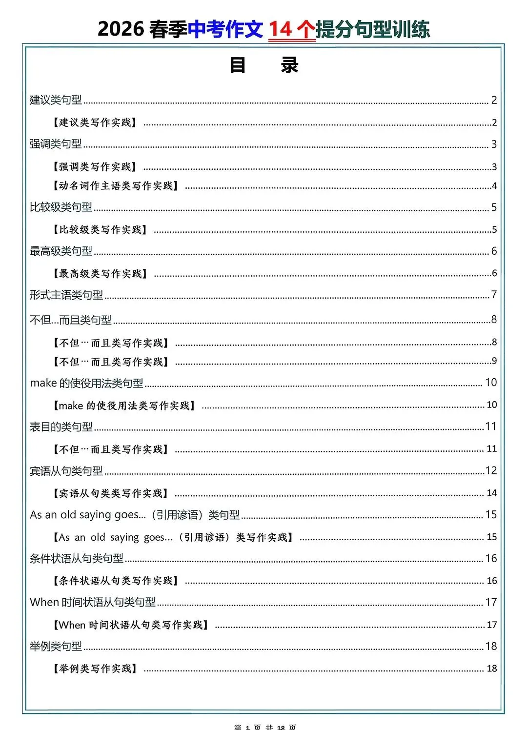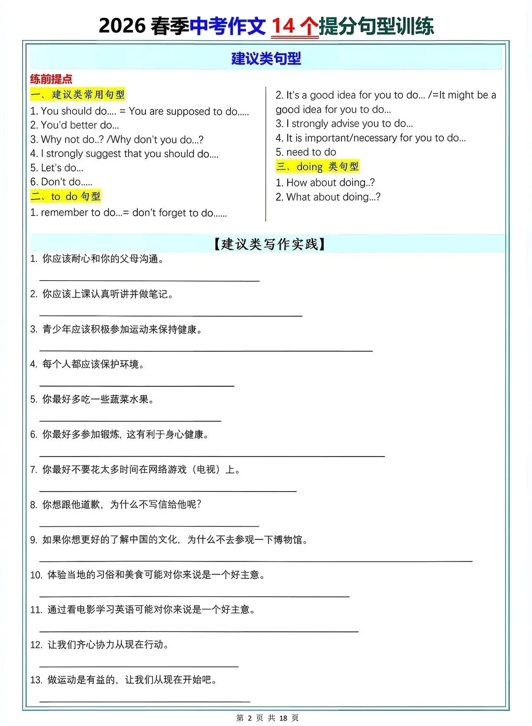 2026中考英语作文14个提分句型训练【电子打印版】