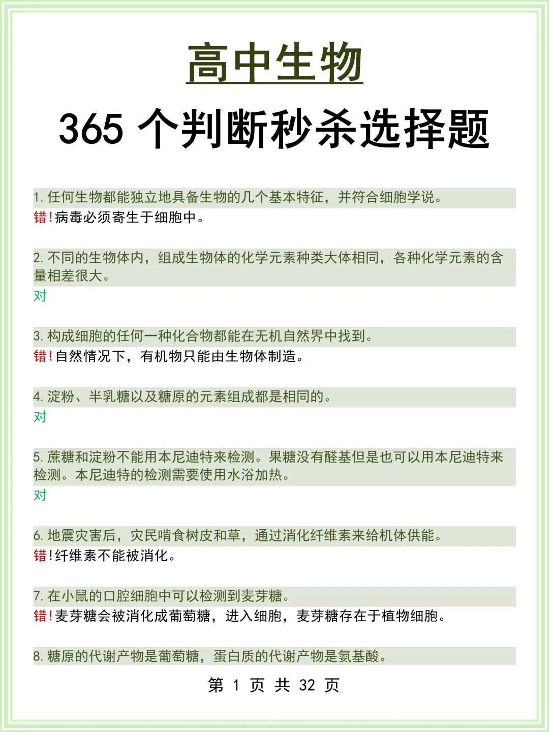 所以今天给大家整理了《高中生物判断秒杀选择题》!建议人手一份