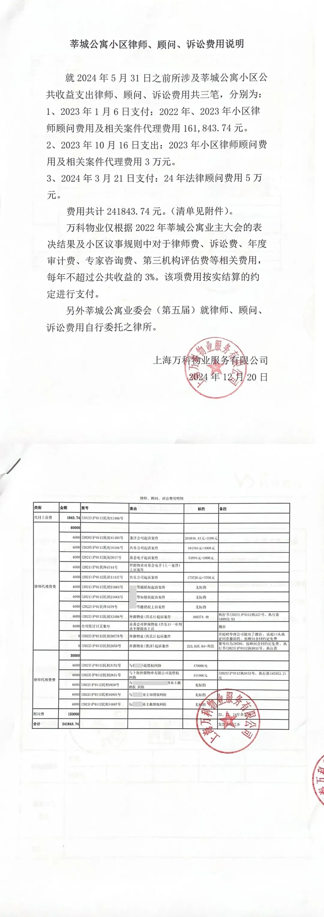 公告:莘城公寓小区律师、顾问、诉讼费用说明