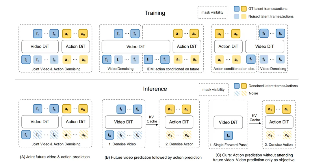 推理阶段:不显式生成未来视频帧,而是将视频 DiT 作为单次前向世界编码器,直接输出潜在表示供动作专家使用 -