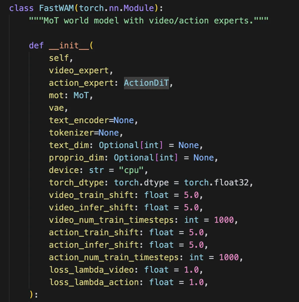 如果只用一句话概括源码结构:FastWAM = Wan 视频专家 + ActionDiT 动作专家 + MoT 共享多层注意力 + VAE + 可选文本编码器