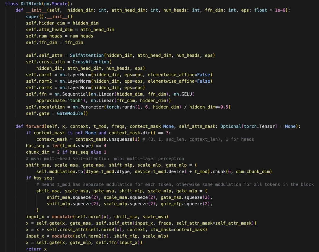 动作专家的代码实现在 action_dit.py 中。它和视频专家非常像,但简化很多: